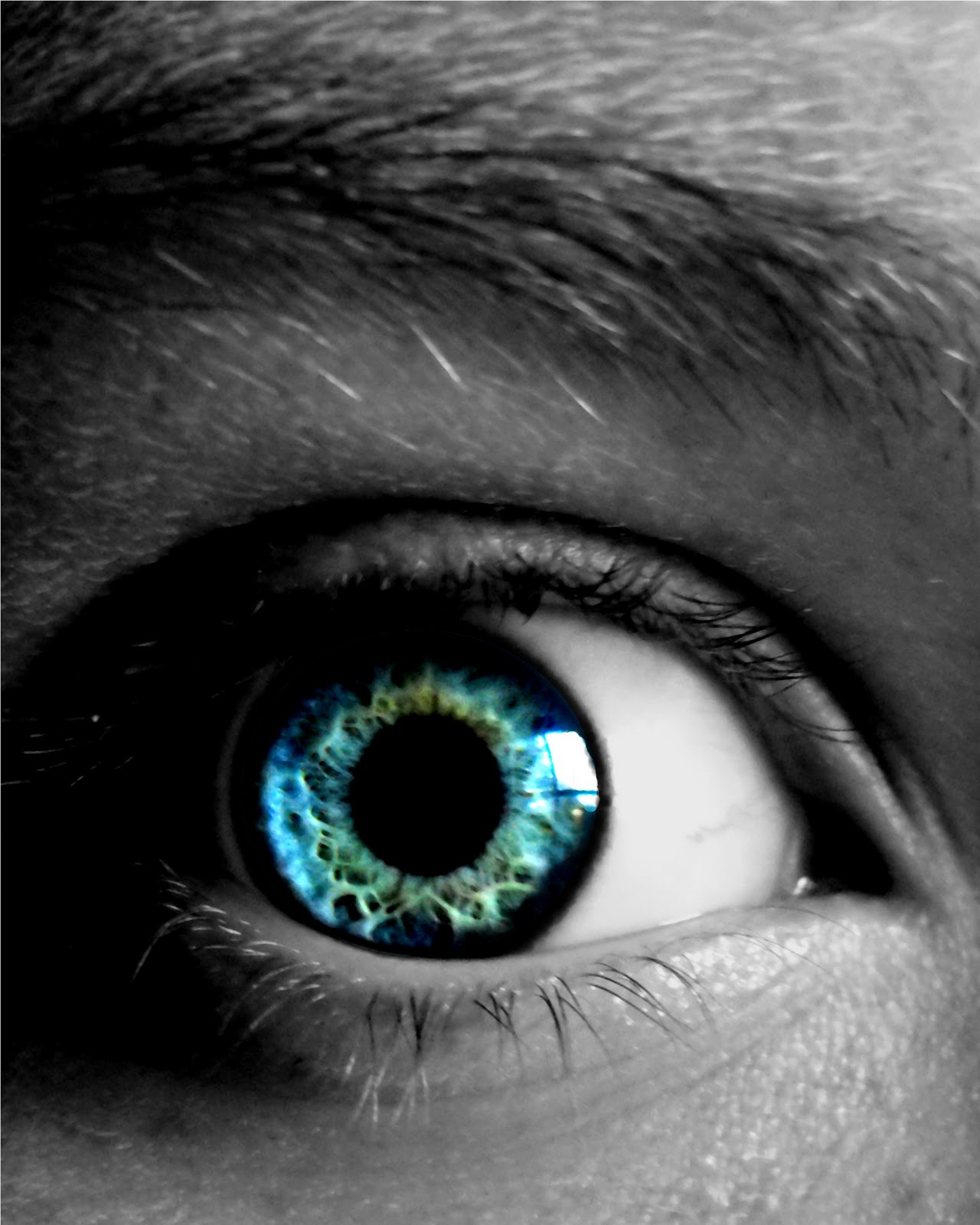 This is a photo of my husband's eye. I used my old editing program to turn everything, but the colored part of the eye, black and white. I then selected just the colored part and increased the contrast and darkened it.